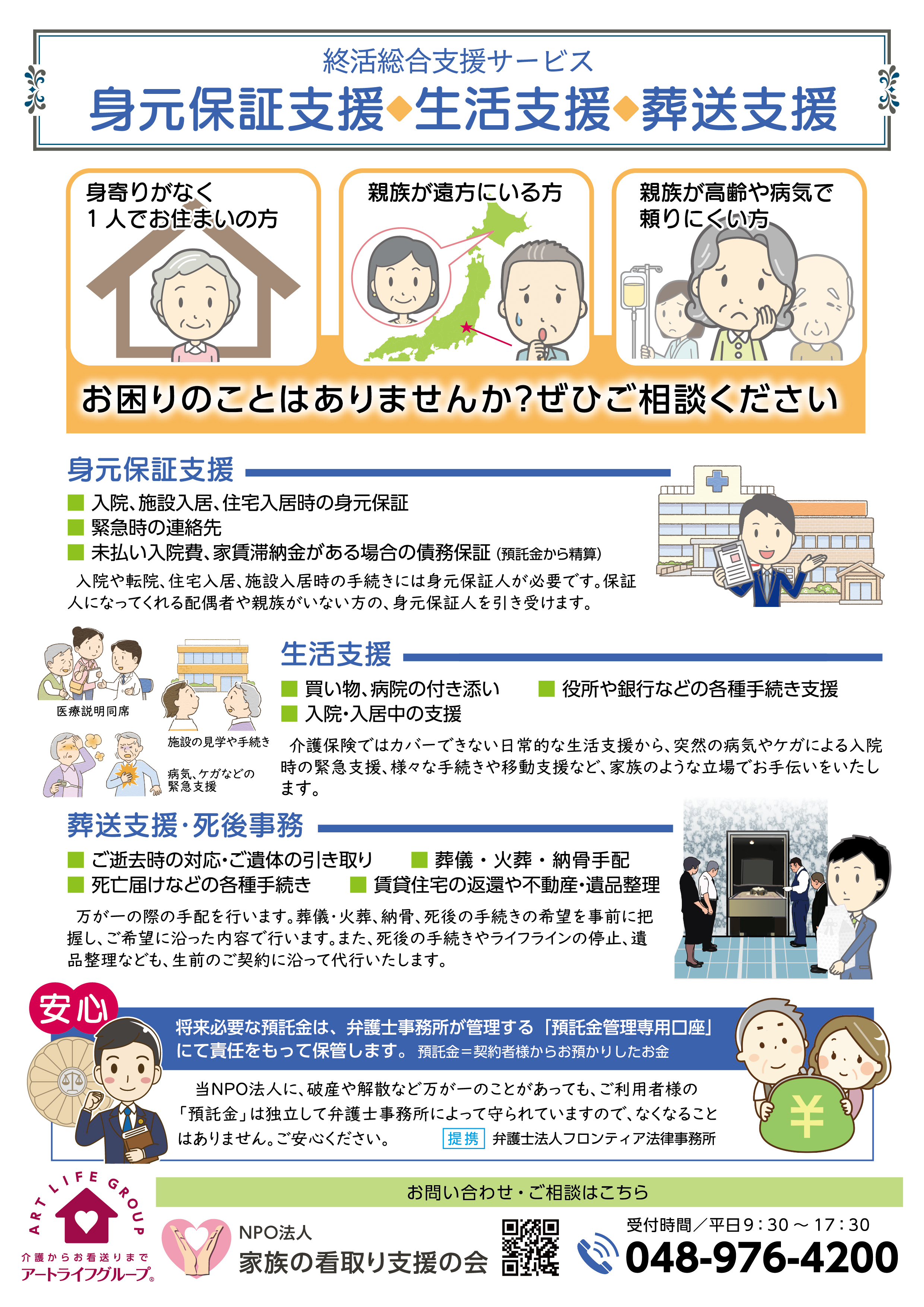 安心して自分らしい人生を全うしたいという方のために、アートライフグループは存在しています。葬儀、介護だけでなく、終活支援のためのNPO法人 家族の看取り支援の会にいつでもお気軽にお尋ねください。(裏面参照)