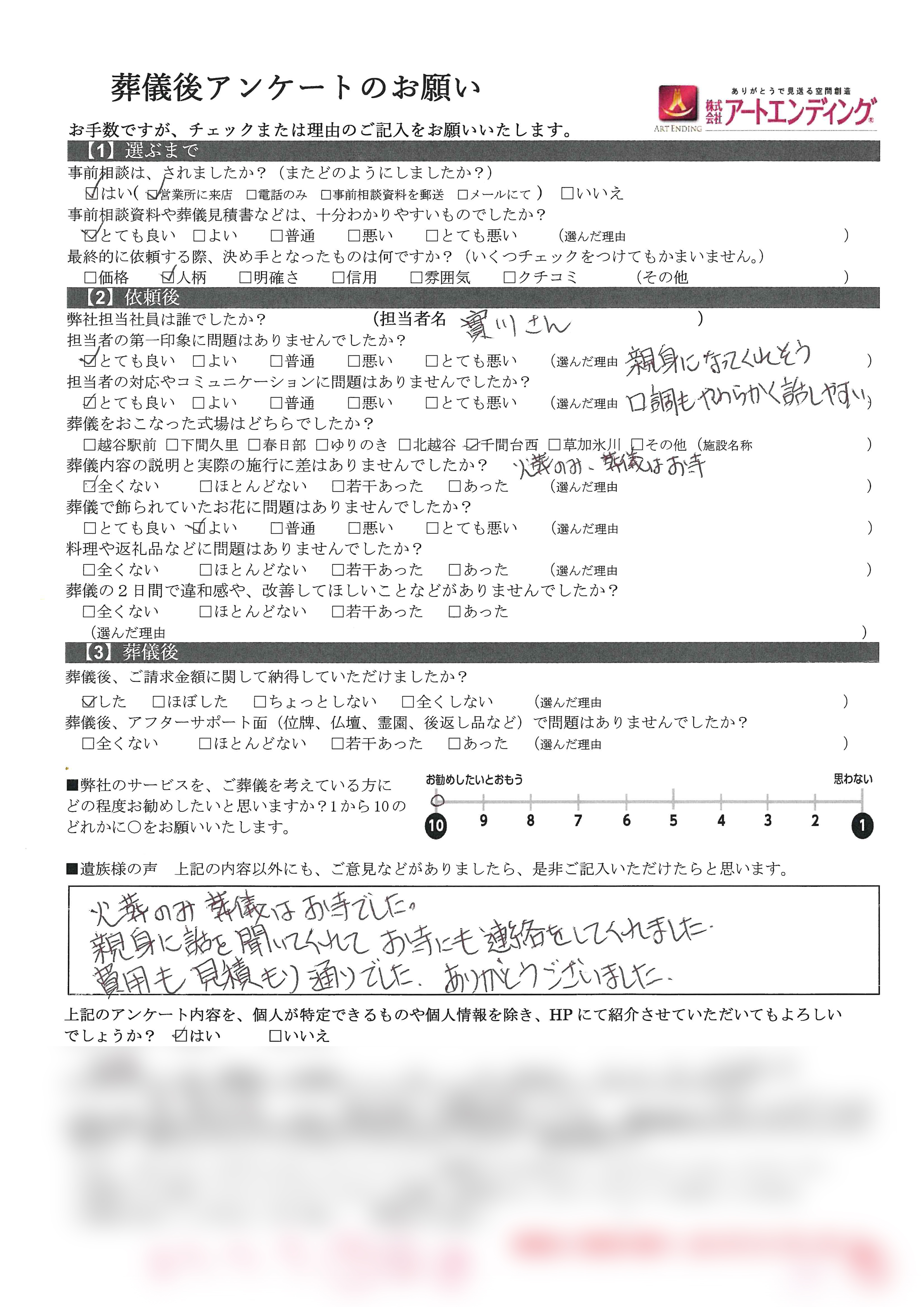 決まりごとを押し付けるのでは無くこちらの要望を聞いて下さり家族葬を行なえたこと感謝しております。 見栄もはらずにこのような葬儀が行なえたことアートエンディングにお願いして良かったと知り合いにお話し致しました。 -